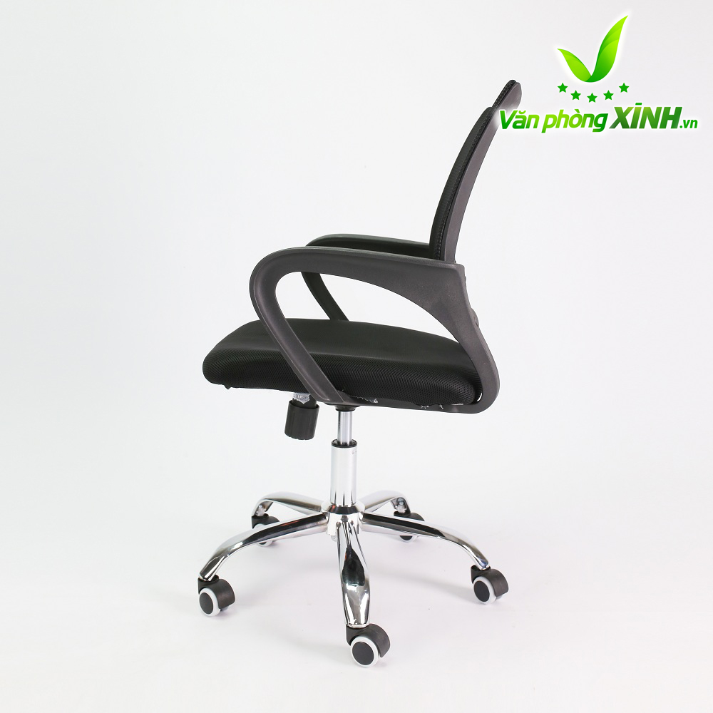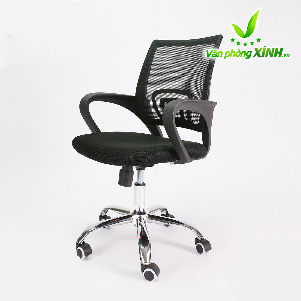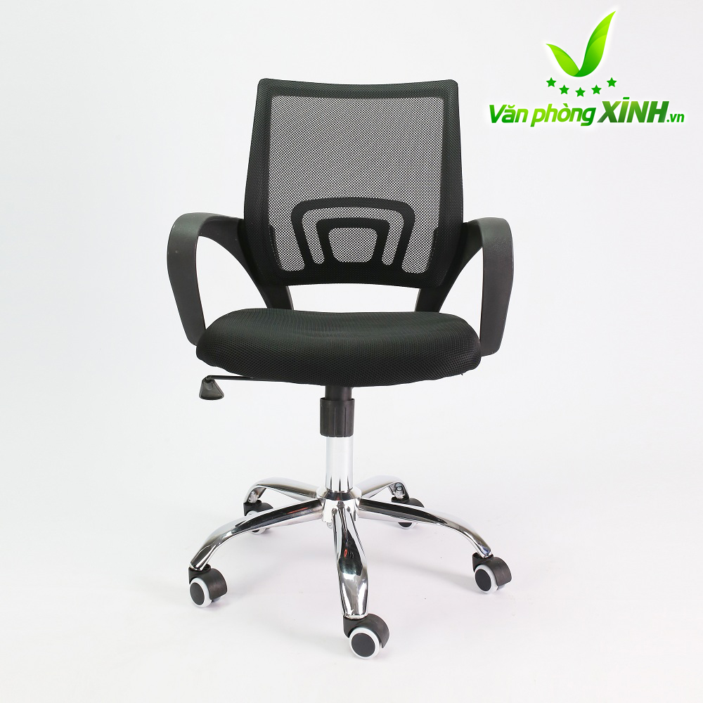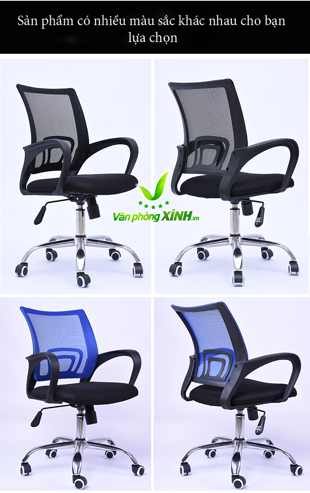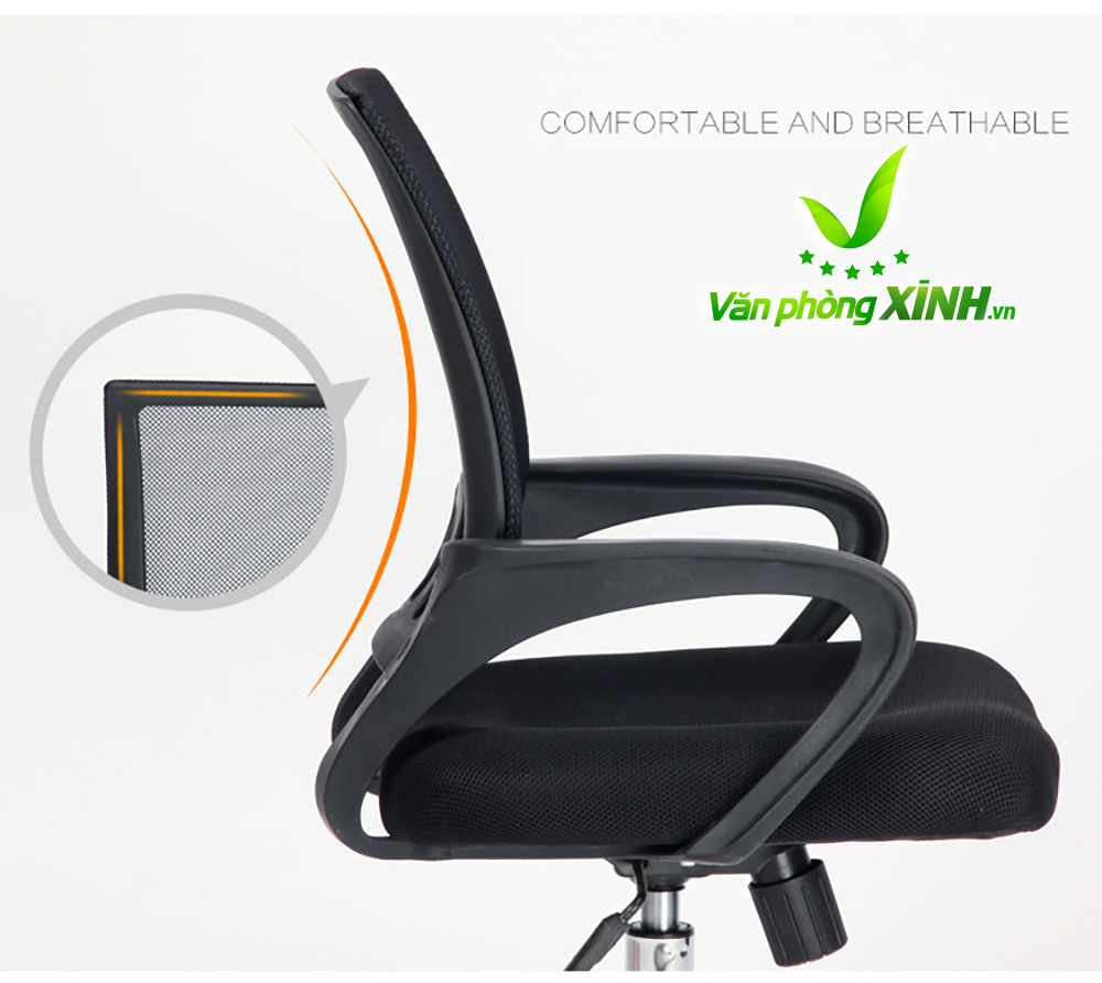 - Chất liệu: tựa lưới, mặt ngồi cốt gỗ, đệm mút, bọc nỉ lưới xốp; tay chân ghế bàng nhựa đen