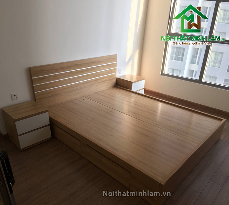 Giường ngủ hiện đại bằng gỗ công nghiệp cho gia đình GN06 trở thành điểm nhấn ấn tượng cho mỗi không gian phòng ngủ nó xuất hiện. Không chỉ cung cấp không gian nghỉ ngơi cho người dùng, giường ngủ hiện đại của Nội Thất Minh Lâm còn đi kèm với kệ để đồ 2 bên đầu giường. Bạn có thể tận dụng phần không gian này để đặt đèn bàn, khung tranh hay đồng hồ báo thức.