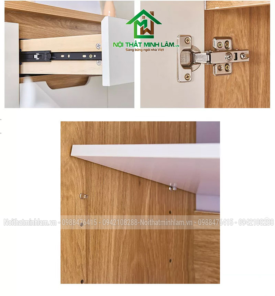 – Khung ván tủ dày 15mm dầy dặn, chắc chắn, phủ melamine 2 mặt tạo lên tủ có độ cứng chắc chống ẩm mốc