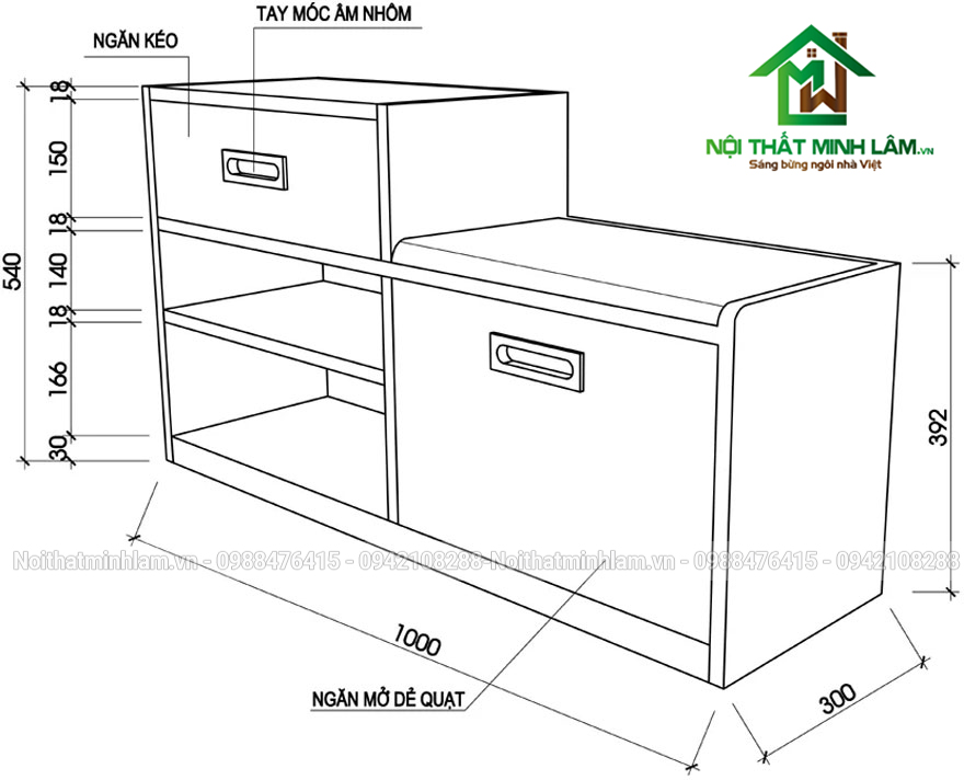 - Kích thước (D x R x C): 1000 x 300 x 540mm