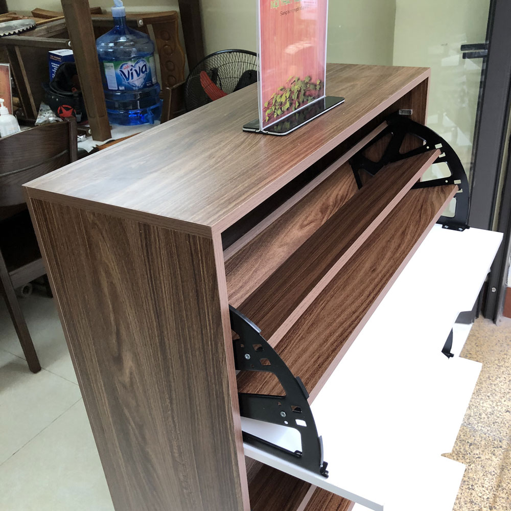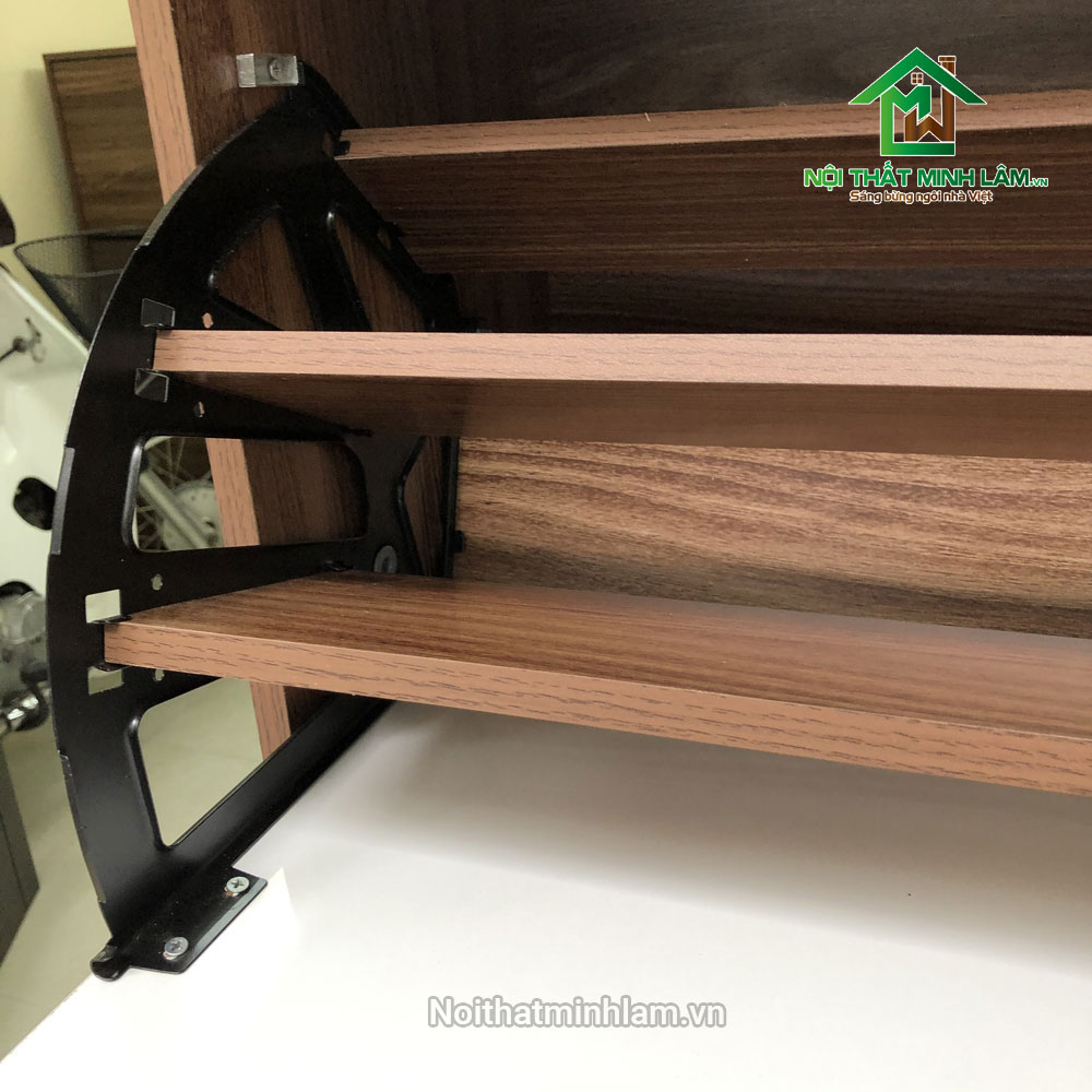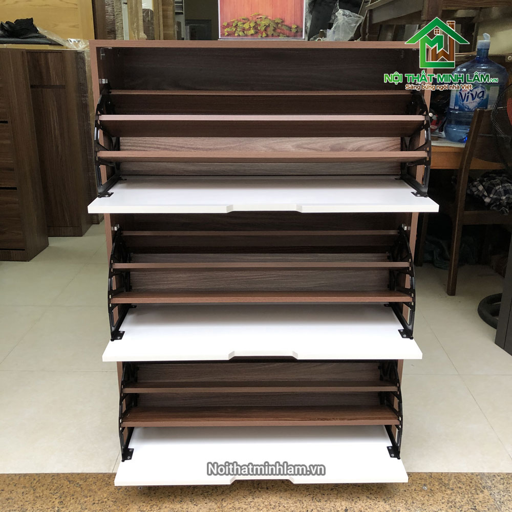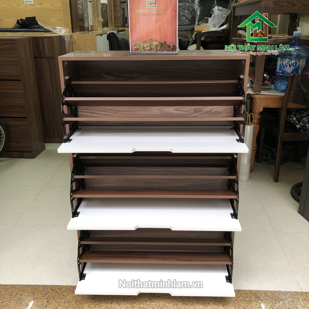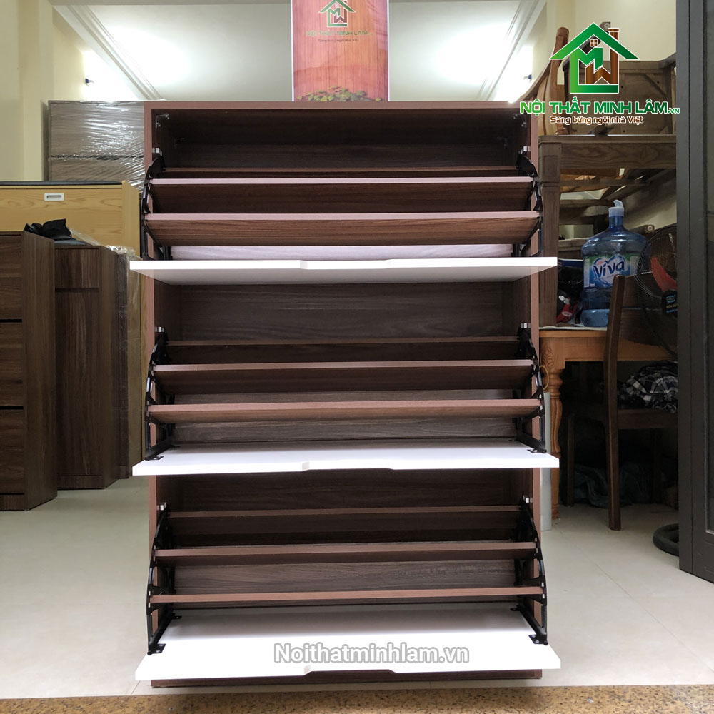 – Cánh mở lật thông minh, mỗi cánh chia làm 3 khoang để giày. Sức chứa gấp đôi tủ giầy thông thường cùng kích thước.