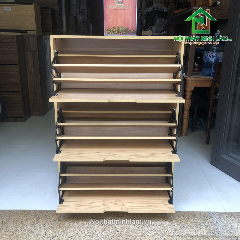 – Cánh mở lật thông minh, mỗi cánh chia làm 3 khoang để giày. Sức chứa gấp đôi tủ giầy thông thường cùng kích thước.