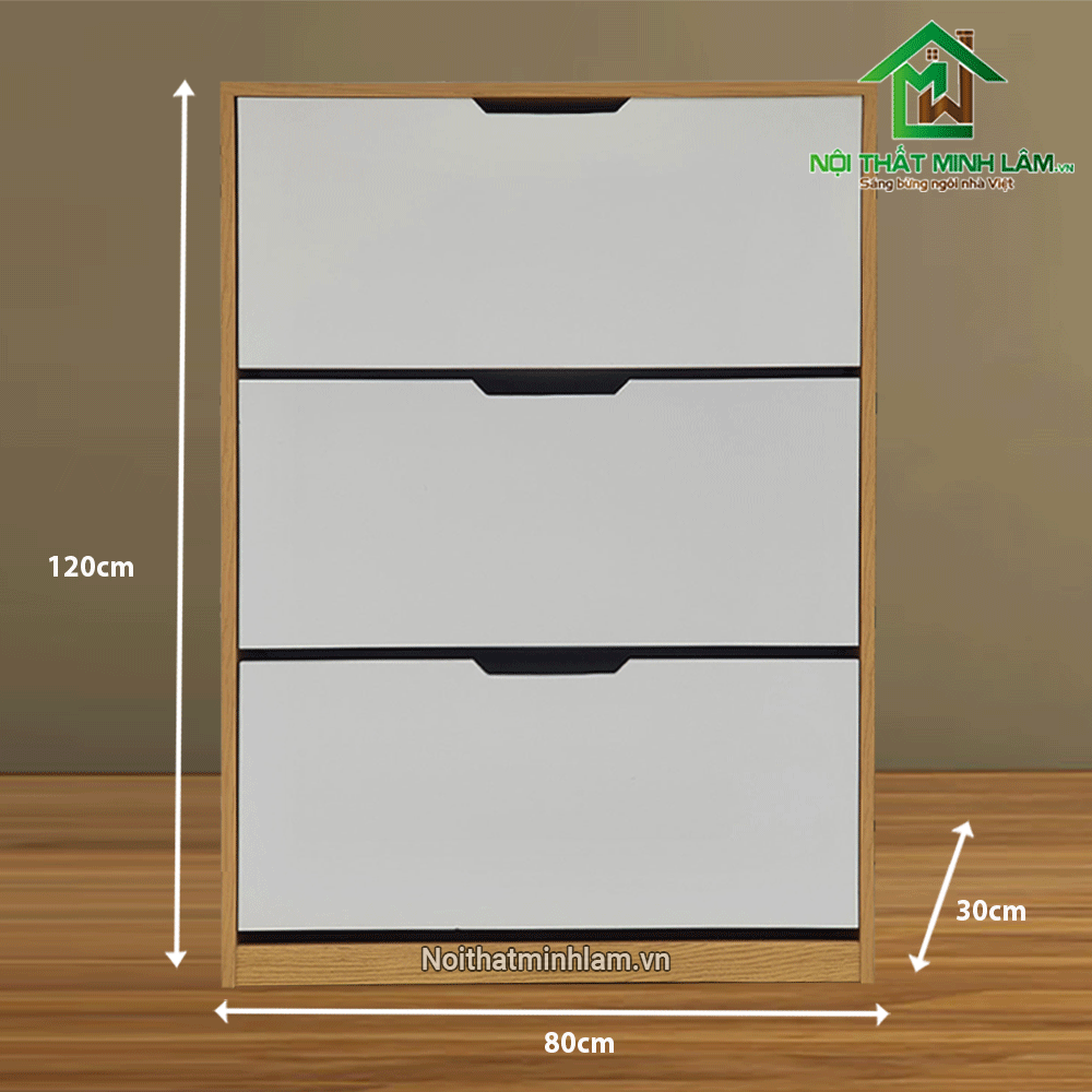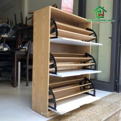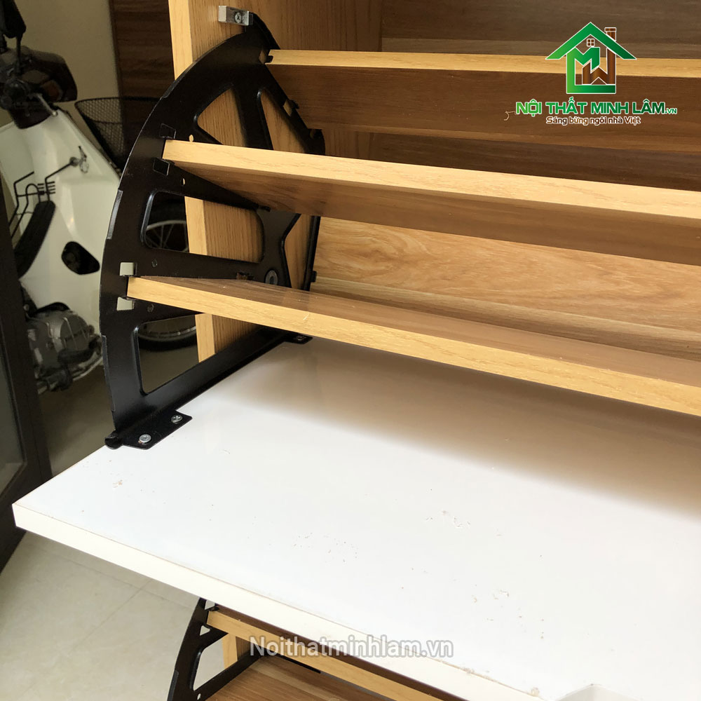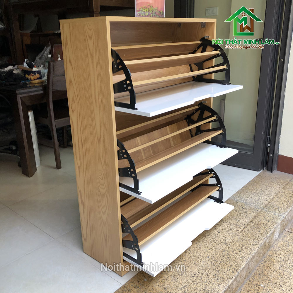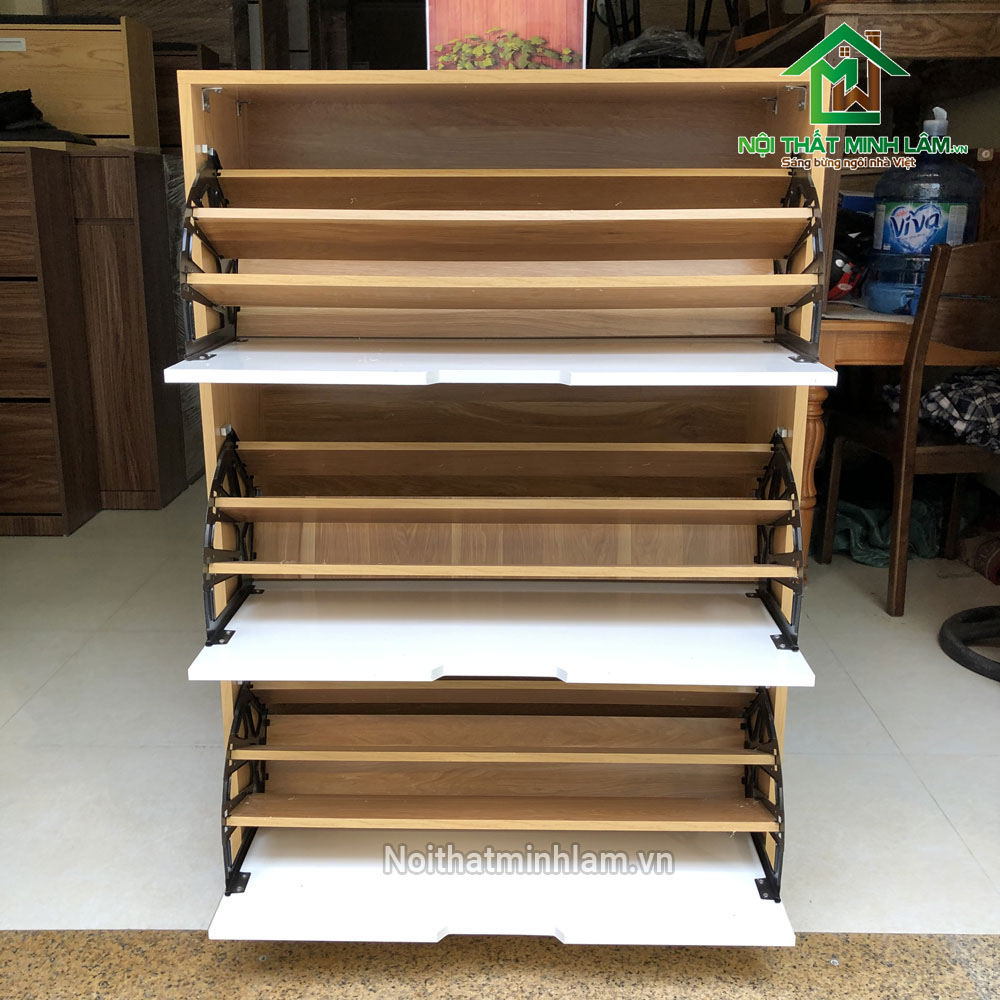 – Cánh mở lật thông minh, mỗi cánh chia làm 3 khoang để giày. Sức chứa gấp đôi tủ giầy thông thường cùng kích thước.
