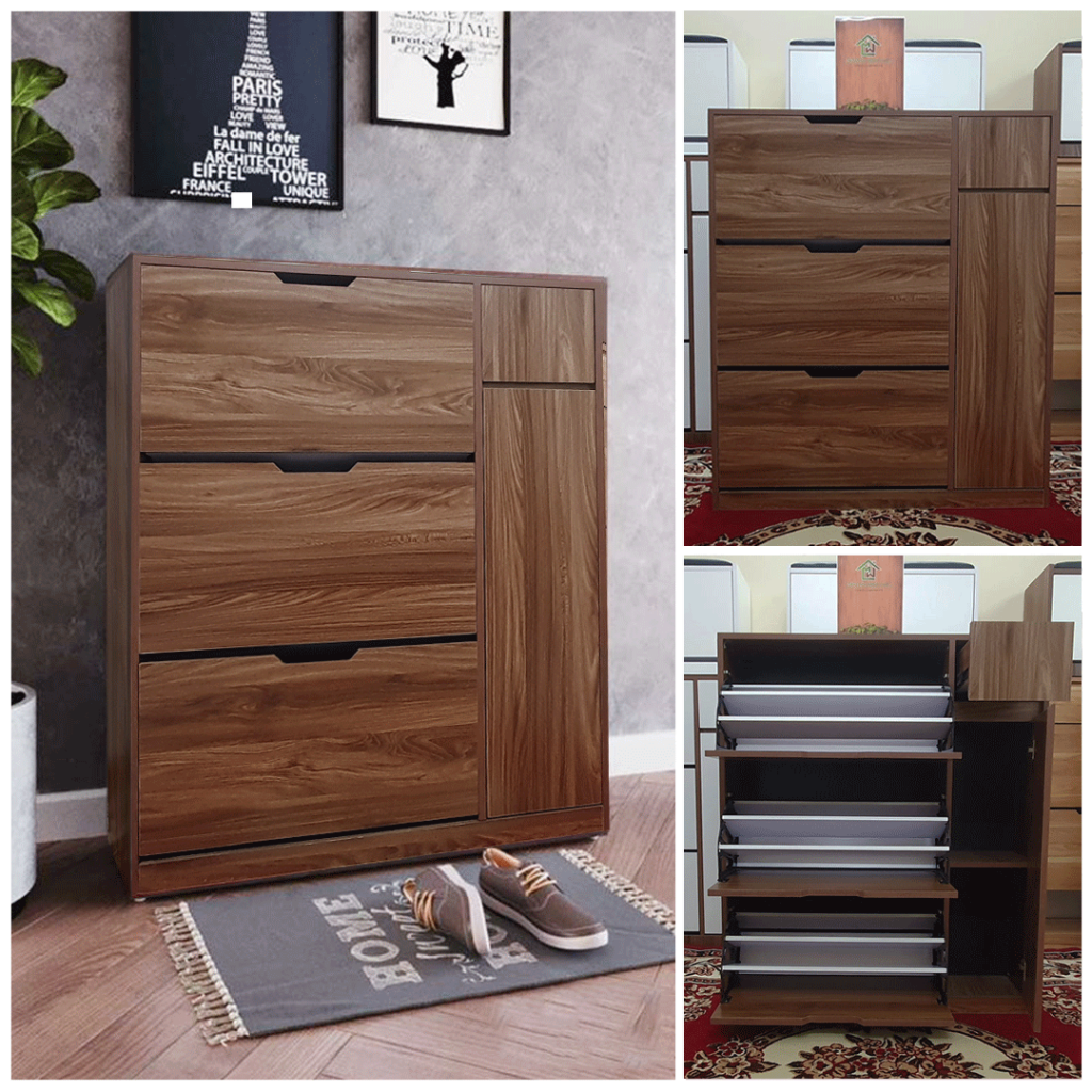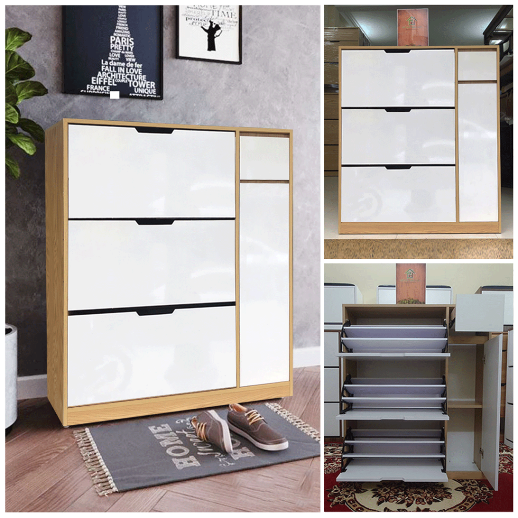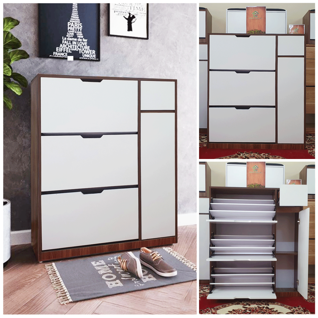 – Cánh mở lật thông minh, mỗi cánh chia làm 3 khoang để giày. Sức chứa gấp đôi tủ giầy thông thường cùng kích thước.