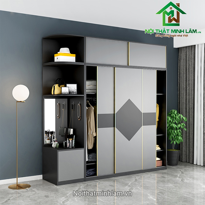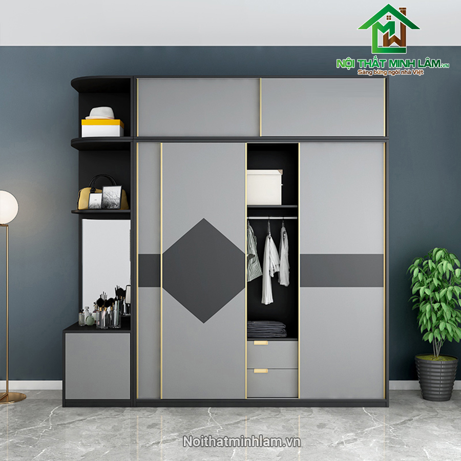 - Về thiết kế, kiểu dáng, mẫu mã: Thiết kế mẫu mã hiện đại, đa năng, vừa là tủ đựng quần áo gia đình vừa là tủ trang trí, tạo điểm nhấn cho không gian, đảm bảo nhu cầu chứa đồ dùng như quần áo, chăn ga cho gia đình bạn.