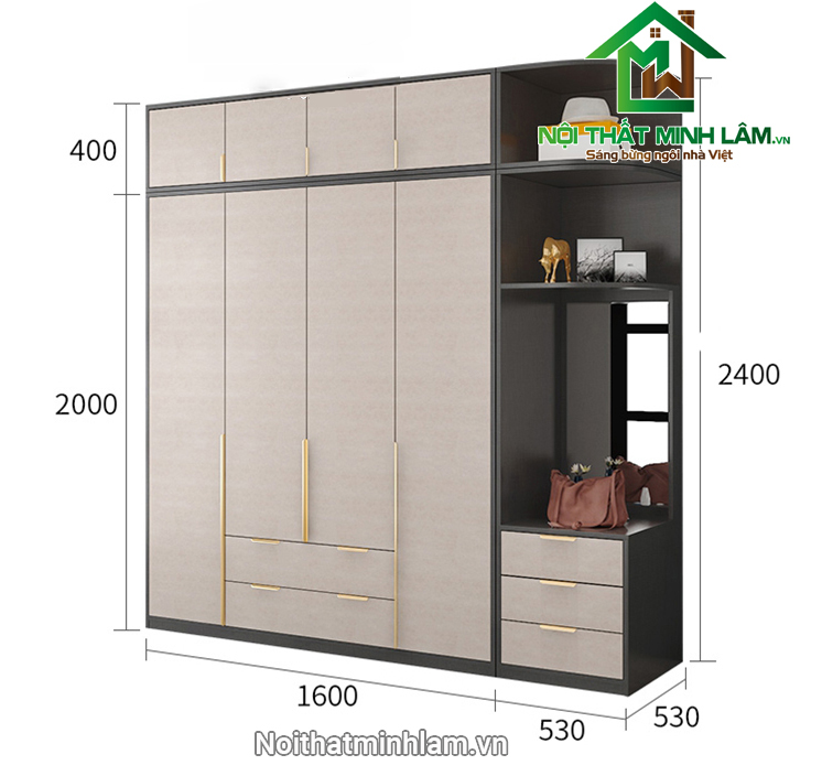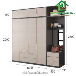 - Tủ 4 cánh kèm giá để đồ: 2043 x 550 x 2500mm